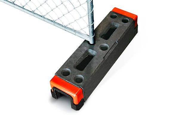 Temporary fence base made of shock- and crack- resistant thermoplastic compound. Replaces fence feet and concrete blocks. 2 weight options, with different colors.