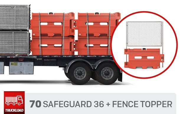This truckload combines 70 units of SafeGuard 36 plastic jersey barriers with 70 fence toppers to create a modular separation solution for temporary traffic control, construction sites, event environments, and mixed-use areas.