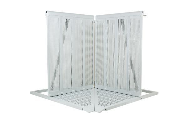 Aluminum concert barricade designed to create 90-degree angles. Fully welded construction with a grey powder coat finish.